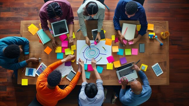 Creative brainstorming session with colorful sticky notes modern office visual organization collaborative environment bird's eye view