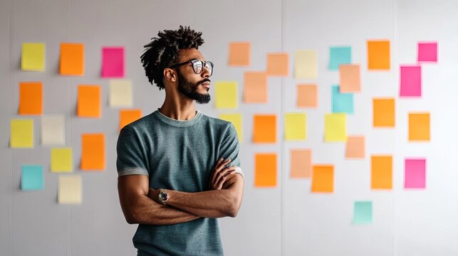 Whiteboard getting covered with colorful sticky notes in office, fueling active brainstorming