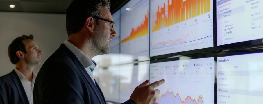 Two professionals actively discussing and analyzing data on a large screen. The setting exudes a modern and collaborative atmosphere, perfect for showcasing teamwork in a business context. AI