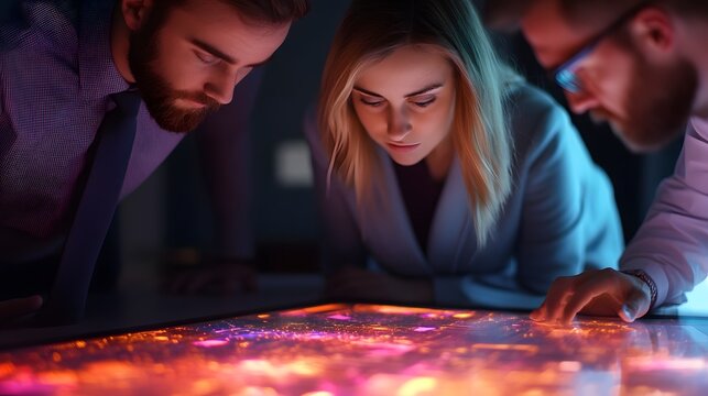 A group of professionals are analyzing complex data visualizations on a large digital screen, indicating a high-tech environment and collaborative work process.