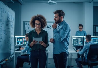 Collaborative team analyzing ai innovation sprint progress displayed on a digital board in modern office environment