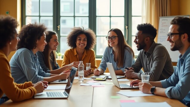 A diverse group of professionals engaged in a lively and collaborative brainstorming session in a modern office setting, sharing laughter and ideas.