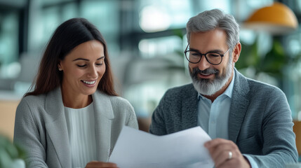 Two colleagues review documents at a modern office desk, appearing engaged and collaborative.