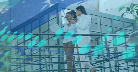 Diverse office team collaborating with digital data overlay