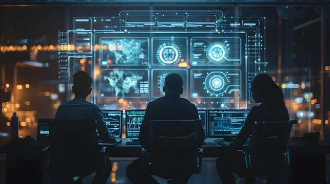 Fraud Detection Team Analyzing Data in Futuristic High Tech Office with Collaborative Digital Tools
