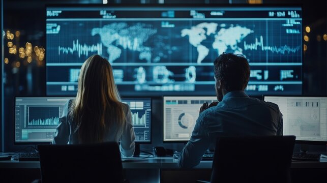 Collaborative business team analyzing global market data on a large digital screen, using advanced analytics for strategic decision making and international tracking.