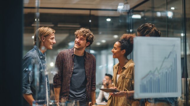 Diverse team discussing data charts in modern office setting