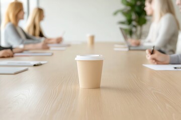 Young professional working on laptop in modern open-plan office with takeaway coffee cup