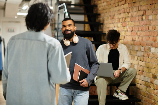 Colleagues engaging in conversation during a collaborative work session at an urban office space