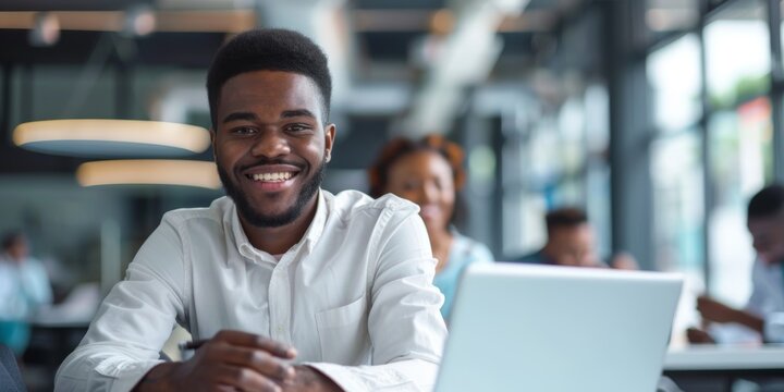 Black businessman, leadership, tablet presentation, team meeting portrait for project planning and strategy. Corporate, collaborative, technology-savvy businessman and speaker.