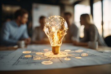 Glowing light bulb with network lines over blueprint on office desk, concept for innovative solution, technology advancement and collaborative project