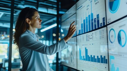 Focused woman analyzing data trends on a large screen in a modern office environment