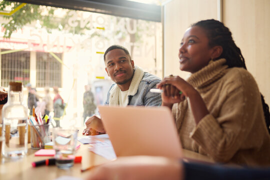 Creative graphic designers discussing project collaboration in office