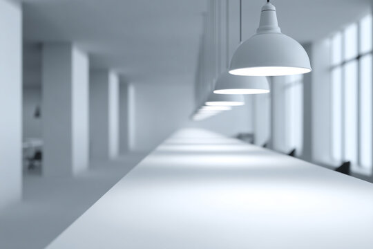Contemporary Office Interior with Extended Desk Layout and Perspective Depth Showcasing Collaborative Work Environment and Productivity