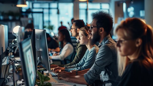 A diverse group of people working diligently on desktop computers in an open office space, indicative of collaborative efforts and a modern work culture.