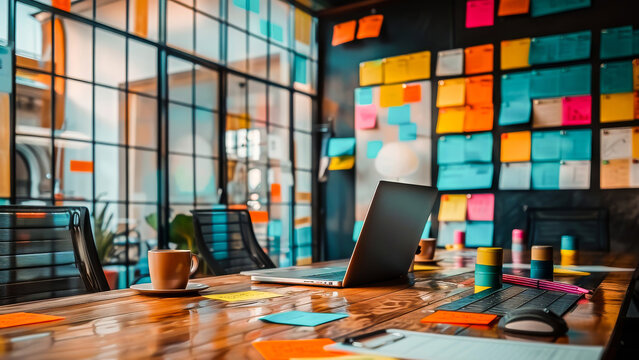 A modern office workspace with a laptop, coffee cup, and colorful sticky notes adorning glass walls, reflecting a creative and collaborative environment. Ideal for business and productivity themes.