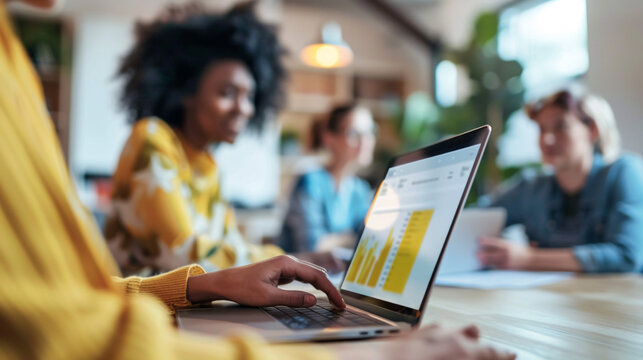 Close-up of diverse teachers sharing teaching resources on a laptop screen in a collaborative workspace