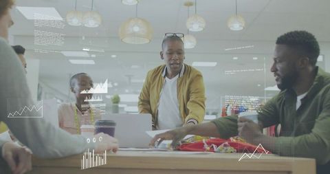 Financial graphs overlaying diverse coworkers in collaborative workspace