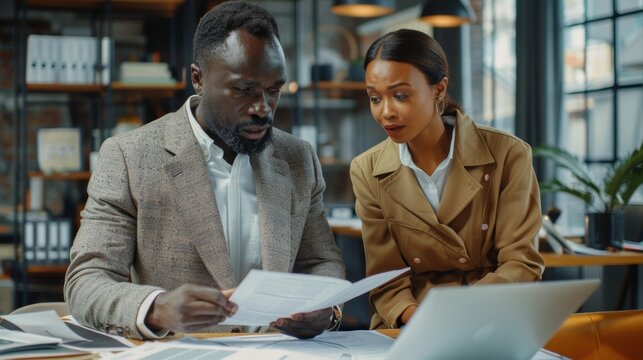 Two focused Black professionals collaborate at desk, reviewing documents and discussing project details, engaged in strategic planning and decision-making in modern office environment.