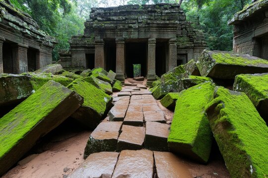 Collapsed temple ruins surrounded by tropical jungle, with moss and vines overgrowing the stones