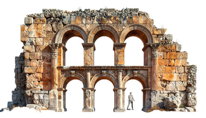 Ancient stone archway ruins with three arches, partially collapsed, with a figure