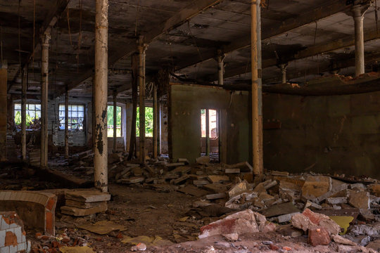 The collapsing remains of a building stand as a stark reminder of devastation, framed by a turbulent and ominous sky, symbolizing the power of nature.