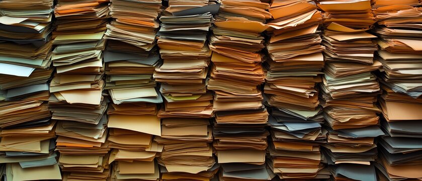 Close-up of a large stack of papers and documents on a desk, symbolizing workload, office work, and paperwork organization.