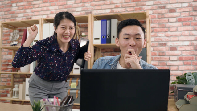 asian female is covering her mouth in surprise and holding fist up to cheer as her startups business team partner using laptop is gesturing to check out the news.