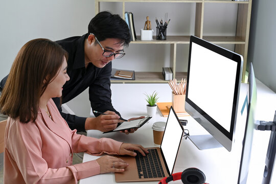 Two diverse business colleagues disscuss biz issue while use laptop in office background