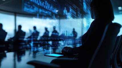 Focused woman analyzing data on a glowing screen in a high-tech environment with colleagues working in the background