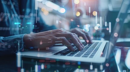 Man Typing Keyboard Laptop Hand.Project Manager Researching Process.Business Team Working Startup modern Office.Global Strategy Virtual Icon.Innovation Graphs Interfaces.Analyze market stock.Blurred