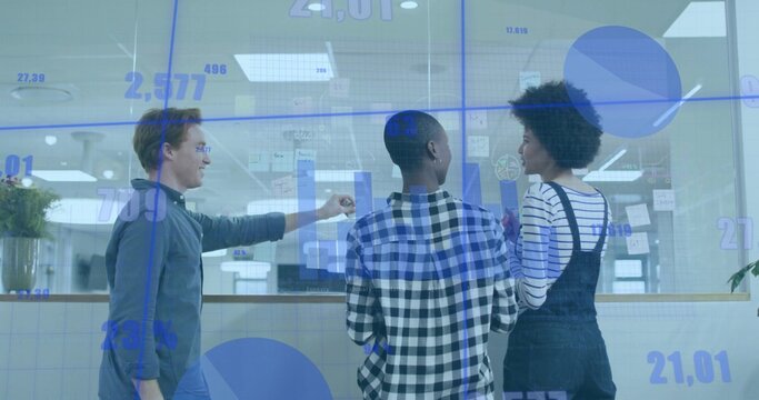 Business collaboration: diverse colleagues analyzing data on chalkboard