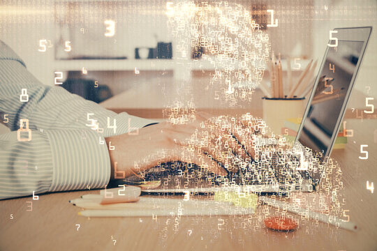 Technology theme hologram with man working on computer on background. High tech concept. Double exposure.