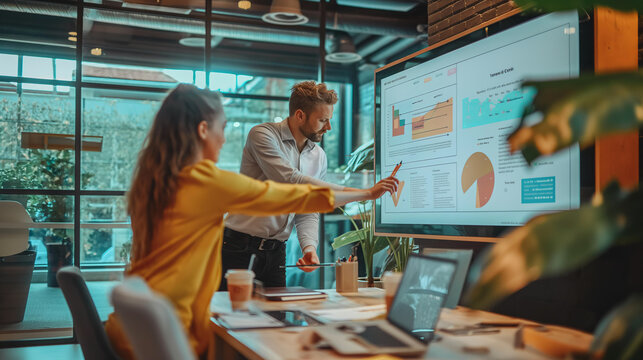 A man and a woman are looking at a large screen with graphs and charts. Scene is focused and professional, as the two people are discussing data