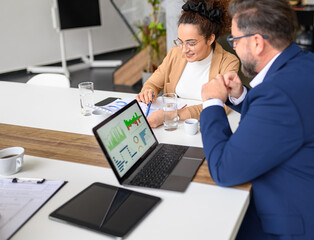 Diverse colleagues analyzing financial graph on laptop in modern office
