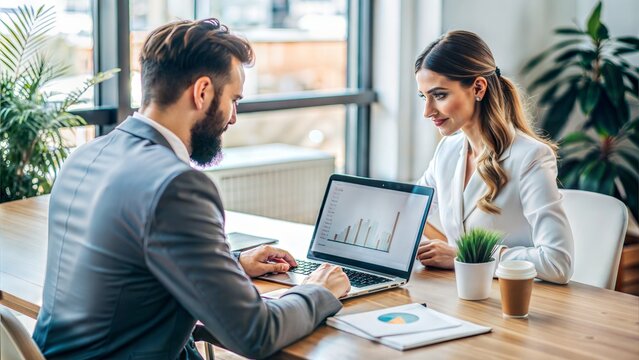 Two colleagues engaged in a financial meeting, with one presenting data from a laptop to the other.