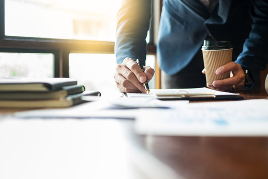 Businessman analyze concept; Young business startup working on market analyst document in graphs and diagramm  on notebook; young coworkers crew working with new startup project