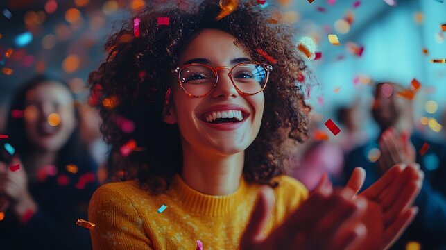 Business woman celebrates success with colleagues, applauding in office. Happy smiling team, diverse group, business environment. Pro female, job promotion, achievement, corporate success.