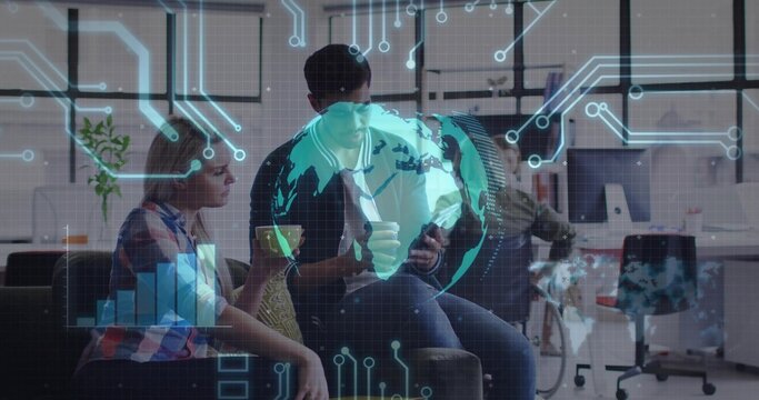 Diverse team collaborating in office with data analytics overlay