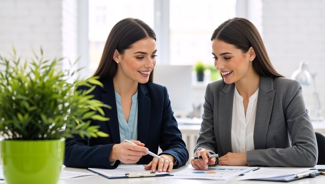Two businesswomen collaborating in a modern office. Professional women analyzing financial charts and reports. Teamwork and corporate success concept