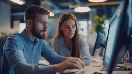 Diverse business professionals collaborating on a computer, a male manager mentoring his female Asian colleague in a modern office