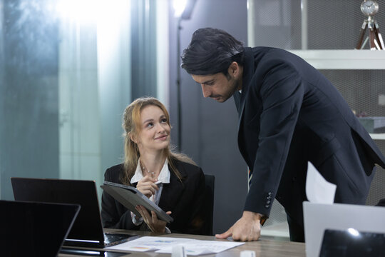 Colleagues Collaborating Over Document In Modern Office Setting Images