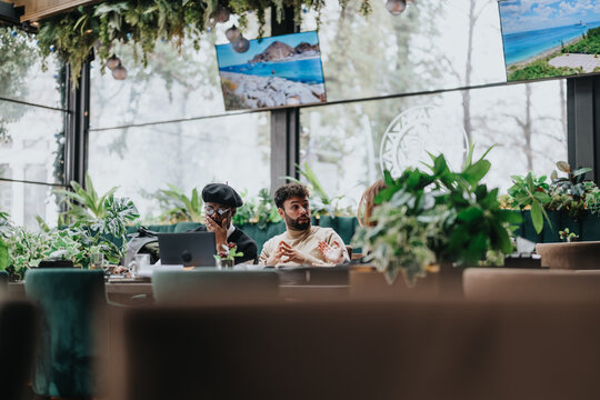 Multiethnic business colleagues collaborating over a project in a modern, plant-filled restaurant environment, signifying teamwork and creativity.