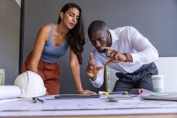 Diverse coworkers collaborating over architectural plans at office desk with blueprints, helmet