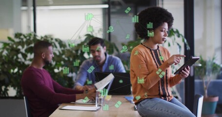 Discussing three coworkers in casual workwear reviewing charts at modern office, with data overlays