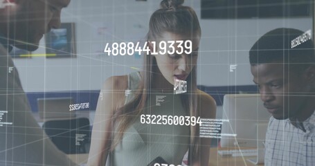 Leaning, three teammates reaching for charts at meeting table in office wear, phone, binary overlay