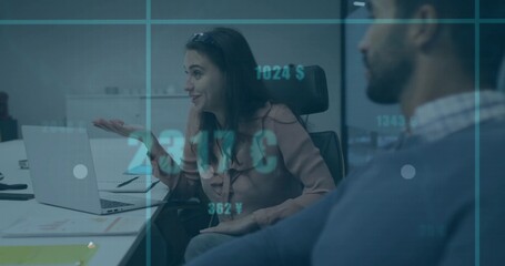 Office colleagues analyzing data points on digital world map overlay in office, with laptops