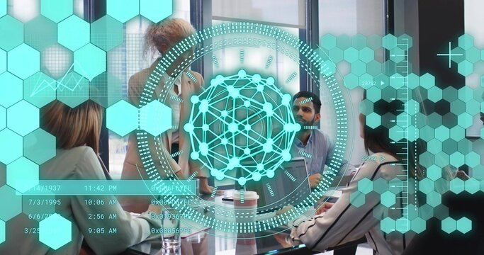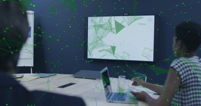 Collaborating business team discussing data on laptop in conference room, digital network overlay