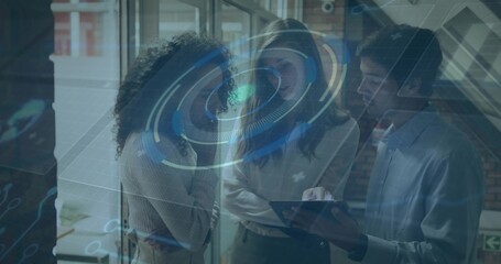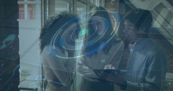 Reviewing tablet, three colleagues in modern office wearing light business attire, HUD overlay