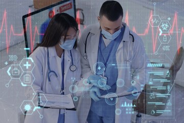 Double exposure of virtual screen and doctors analyzing scientific data in laboratory